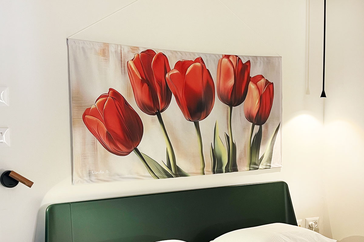 עבודה עדינה שמכניסה רכות, צבע וחיים לחלל השינה, עם חיבור טבעי בין יצירה לתאורה.