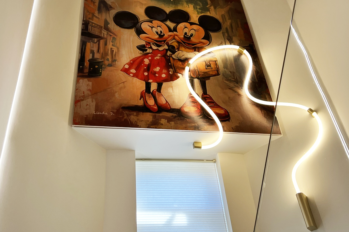 חיבור בין יצירה, תאורה ותנועה במרחב, כך שהקיר והמדרגות הופכים לחוויה אחת.