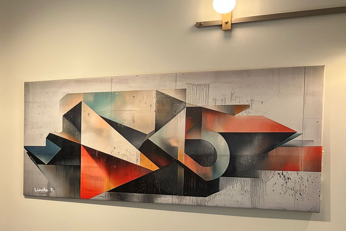 יצירה גאומטרית בהתאמה מלאה לחלל, צבעים ותאורה. חיבור בין קווים, חומרים ואלמנטים בבית - ליצירת קומפוזיציה מדויקת שמרגישה חלק טבעי מהחלל.